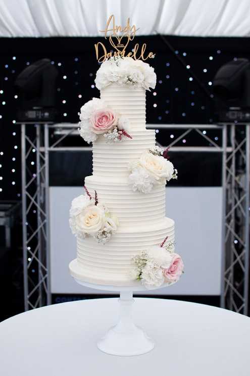 Non-edible fresh flowers, supplied by Courts of Rayleigh, were carefully sealed to protect the cake from any sap before I arranged then across the cake. The cake was then topped with a lovely personalised wooden topper sourced from Etsy.